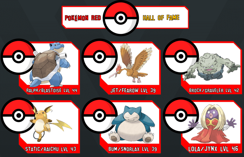 The second run was done much better as I able to really used 2 to 3 Pokémon each battle. Static and Bum handled Lorelei Ice Pokémon, mainly Static was most of the Pokémon were also Water Type. Ralph, LOLA and Jet took care of Bruno. Brock and LOLA handled Agatha’s team though the confusion was a pain. Lance was still a bit of a problem but once Gyarados was out the way LOLA pretty much had it in the bag. After beating Lance, I was told there was one more challenge, took the time to heal up the time then it was time. Gary the rival was now Gary the Champion. I sent Brock out to take care of Pidgeot, Ralph handle his Rhydon and Arcanine, and Static took out Gyarados. Then came out his Alakazam, this took a bit more team of Static slowing it down with Thunder Wave and Bum and LOLA laying the smack down. Finally, he sent out his Venusaur and with a combined effort of Jet and LOLA it was defeat and a new champion was crowned. My team was inducted into the Hall of Fame and then the credits rolled.