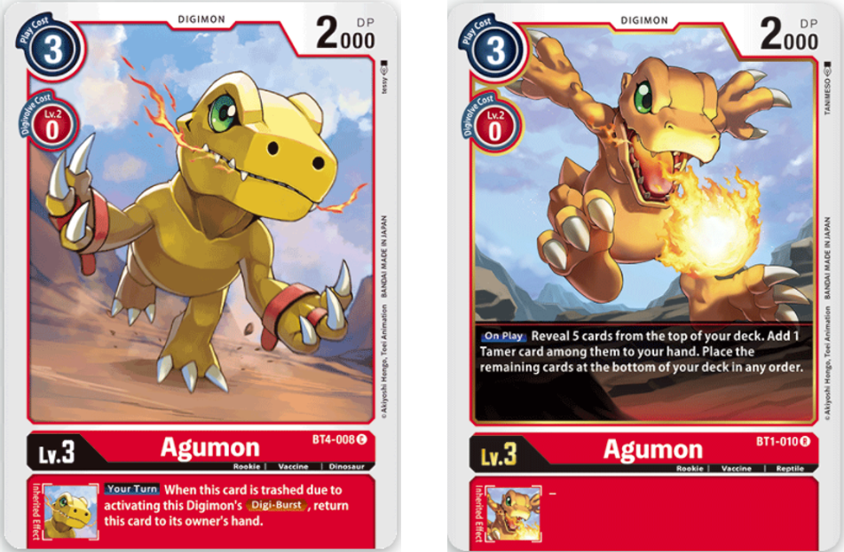 The right Agumon (BT1-010) has the ability that if played straight to the field, reveal the top 5 cards of your deck and add 1 tamer to your hand. Using could help get Tamers on to the field to try to activate Digimon abilities.
