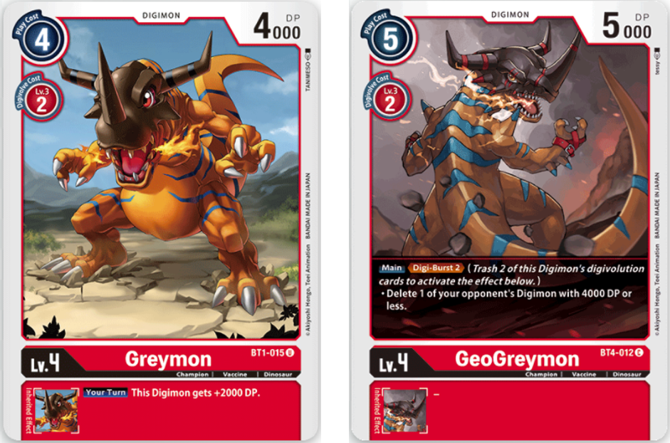 Greymon will be used to give your level 5 and 6 Digimon a power boost on your turn, while GeoGreymon will be used to remove Digimon from the field. It’s recommend to digivolve from Agumon (BT4-008) so you only send 1 Digimon to the trash.