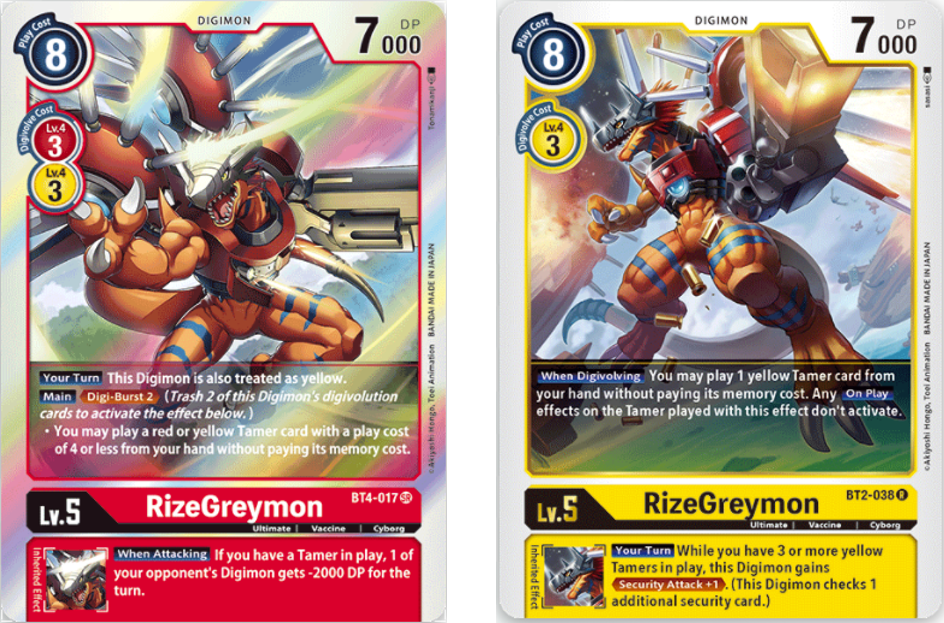 Yellow RizeGreymon has a similar ability but it activates when it digivolves you can play a Yellow Tamer from you hand at now cost. Also has the inherited ability that if you have 3 yellow Tamers in play it gain’s the ability to check 1 addition security card when attacking the opponent.