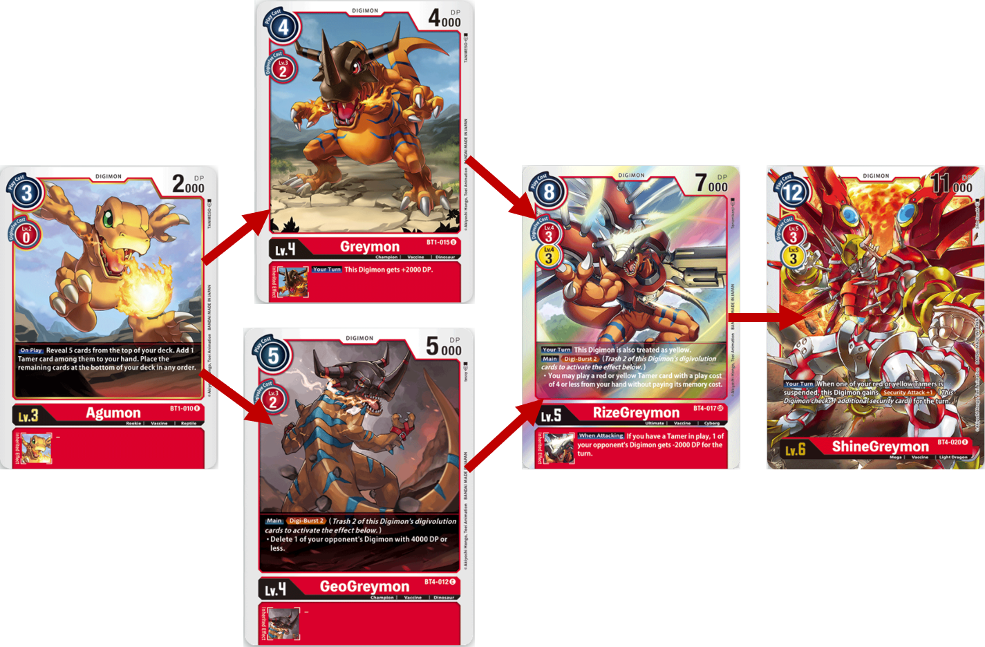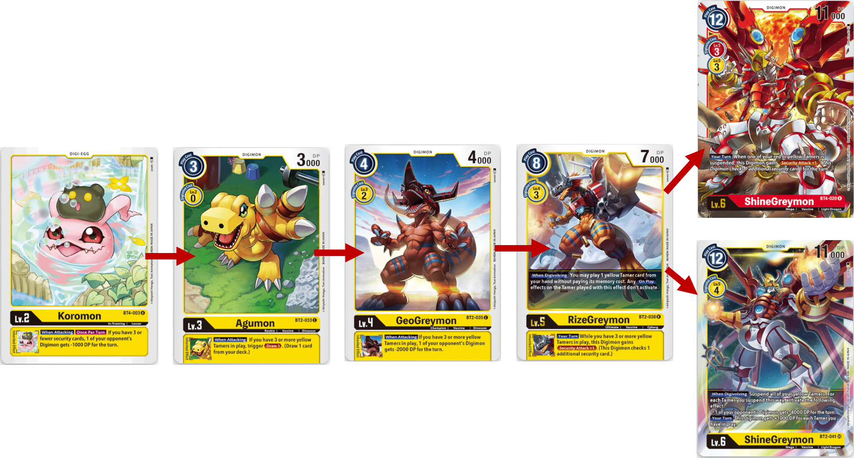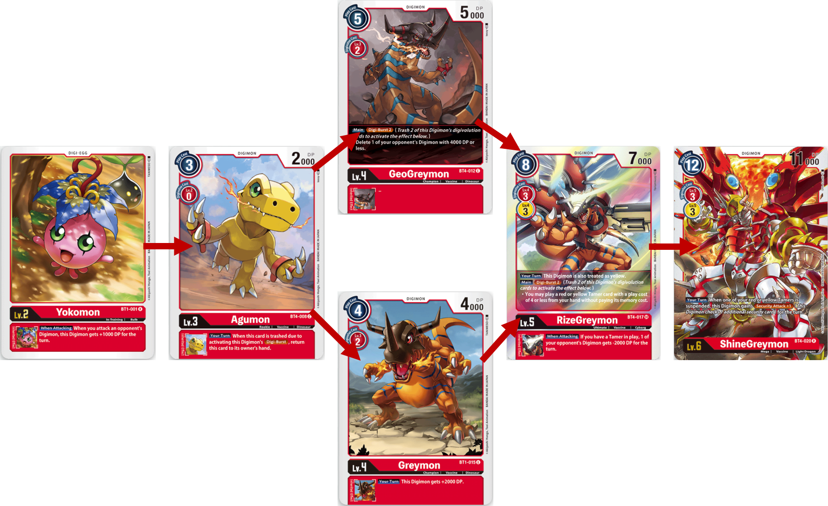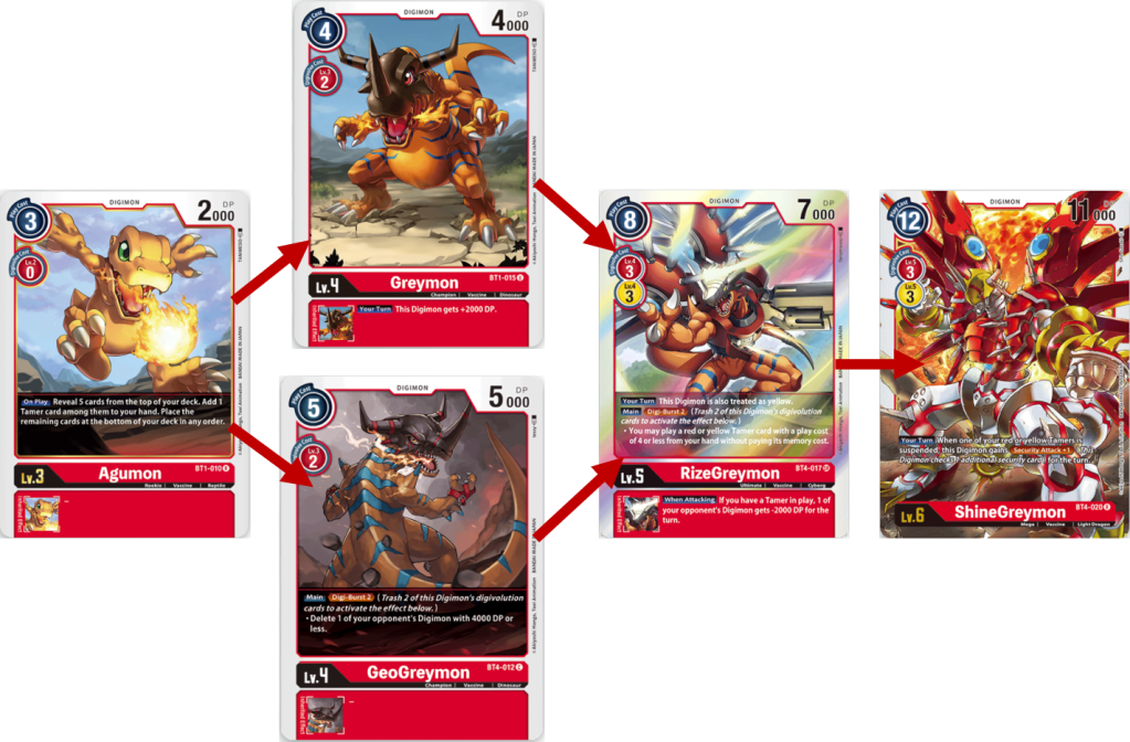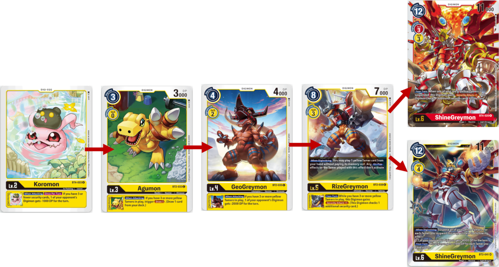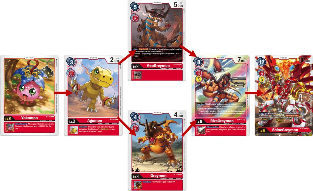 Starting from the breeding area, you will digivolve Yokomon to Agumon for 0 cost, next you will either digivolve Agumon into either GeoGreymon or Greymon. I would recommend Greymon cause on your turn it will give you additional 2000 DP. Now, if you need to remove your opponents Digimon to stop a build up to something powerful or remove a Digimon with an annoying ability then I good with GeoGreymon and use its Digi-Burst to return Agumon to your hand and trash Yokomon. Next you would Digivolve into RizeGreymon then into ShineGreymon. This path will be good and giving ShineGreymon extra power to attack, weaken an opponents field and if you can get an extra Security attack, blow through their security cards.
