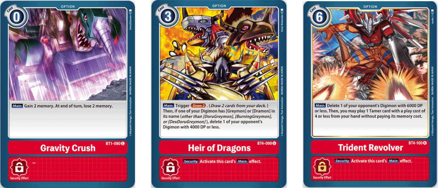 Heir of the Dragons is a good way to work your way through the deck to get needed cards and if you have Greymon, GeoGreymon, RizeGreymon or ShineGreymon you can deleted of your opponent’s Digimon with 4000 DP or less.