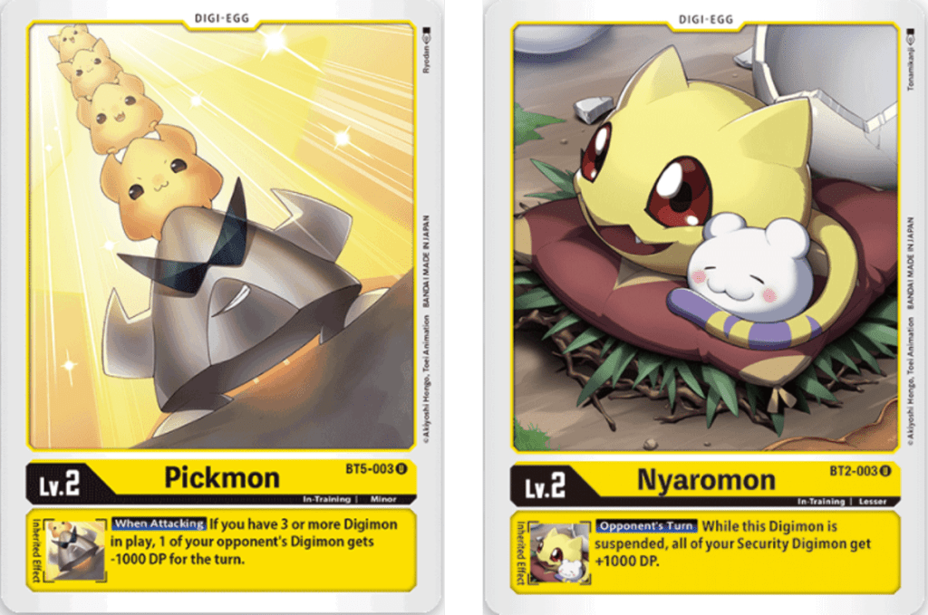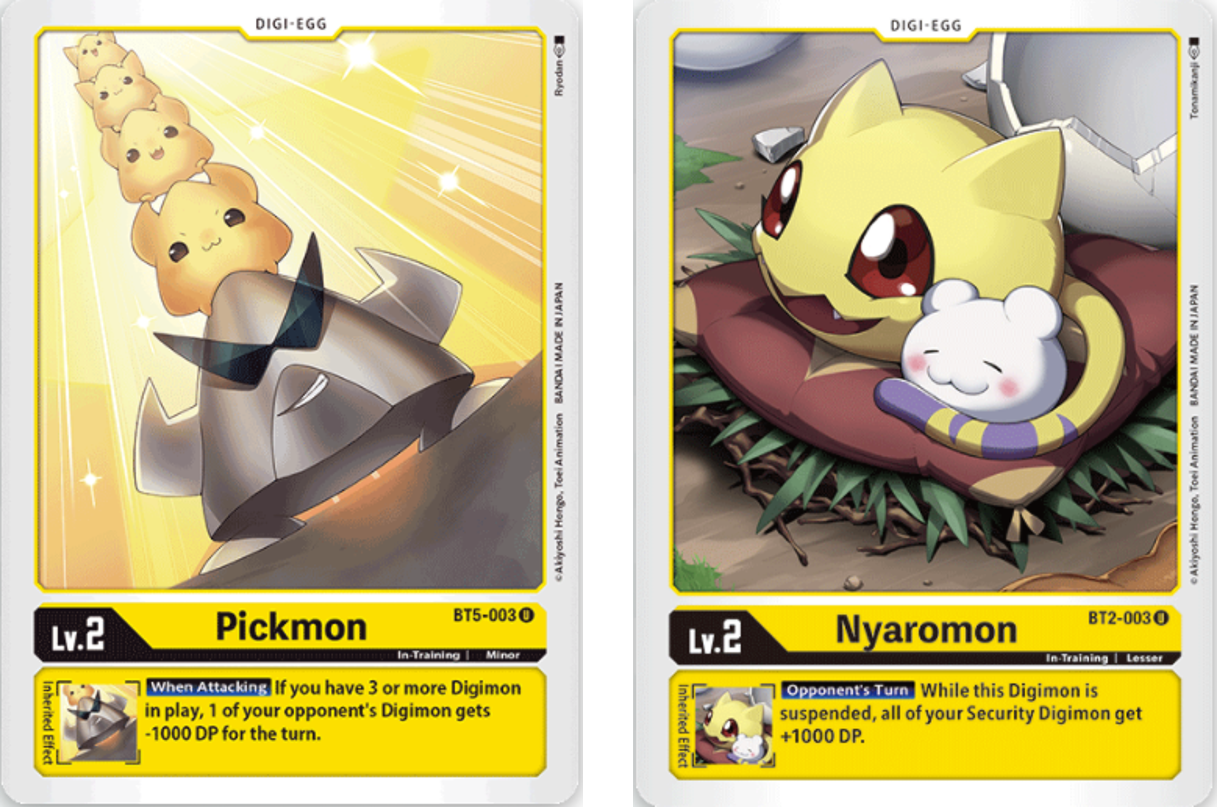 Pickmon can be used to weaken your opponents Digimon if you keep your side of the field filled with Digimon. Nyaromon is used to power up any Digimon in your Security Stack to help give them a fighting chance against your opponents attack.