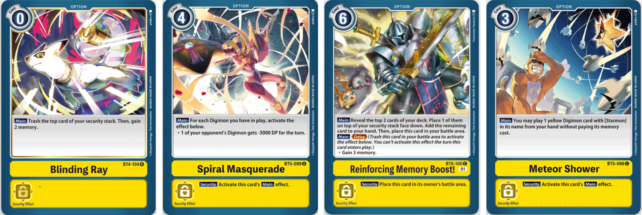 Starting with Blinding Ray, you can trash the top card in your security stack to gain to memory which can be combine with Digimon effects that give you resources when cards are removed from the security stack on your turn.