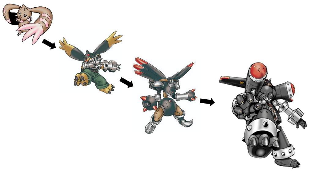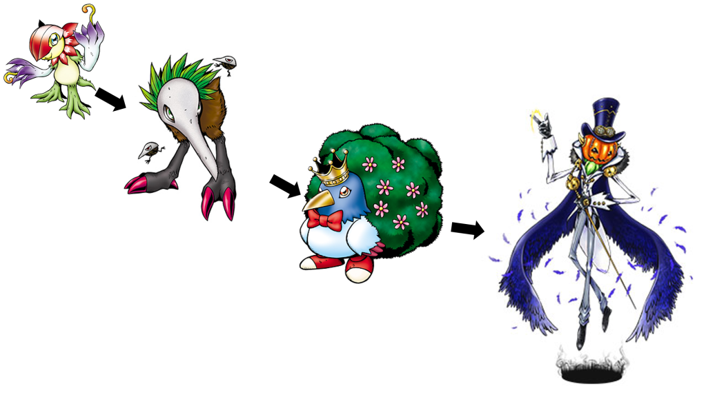 This was another hard one as my gut reaction was to go with Rafflesimon or Lotusmon as alternatives to the Rosemon line we usually see and really didn’t finalize on the line until writing the final version of this post. The line I finally decided on was Floramon to Kiwimon to Deramon and finally NoblePumpkinmon as the mega. Before anyone says anything, I know, Deramon to NoblePumpkinmon is a big leap but I like the plant royalty and the only mega in the encyclopedia that fit was NoblePumpkinmon. This was hard cause I was really trying not to end with Rosemon or Puppetmon.